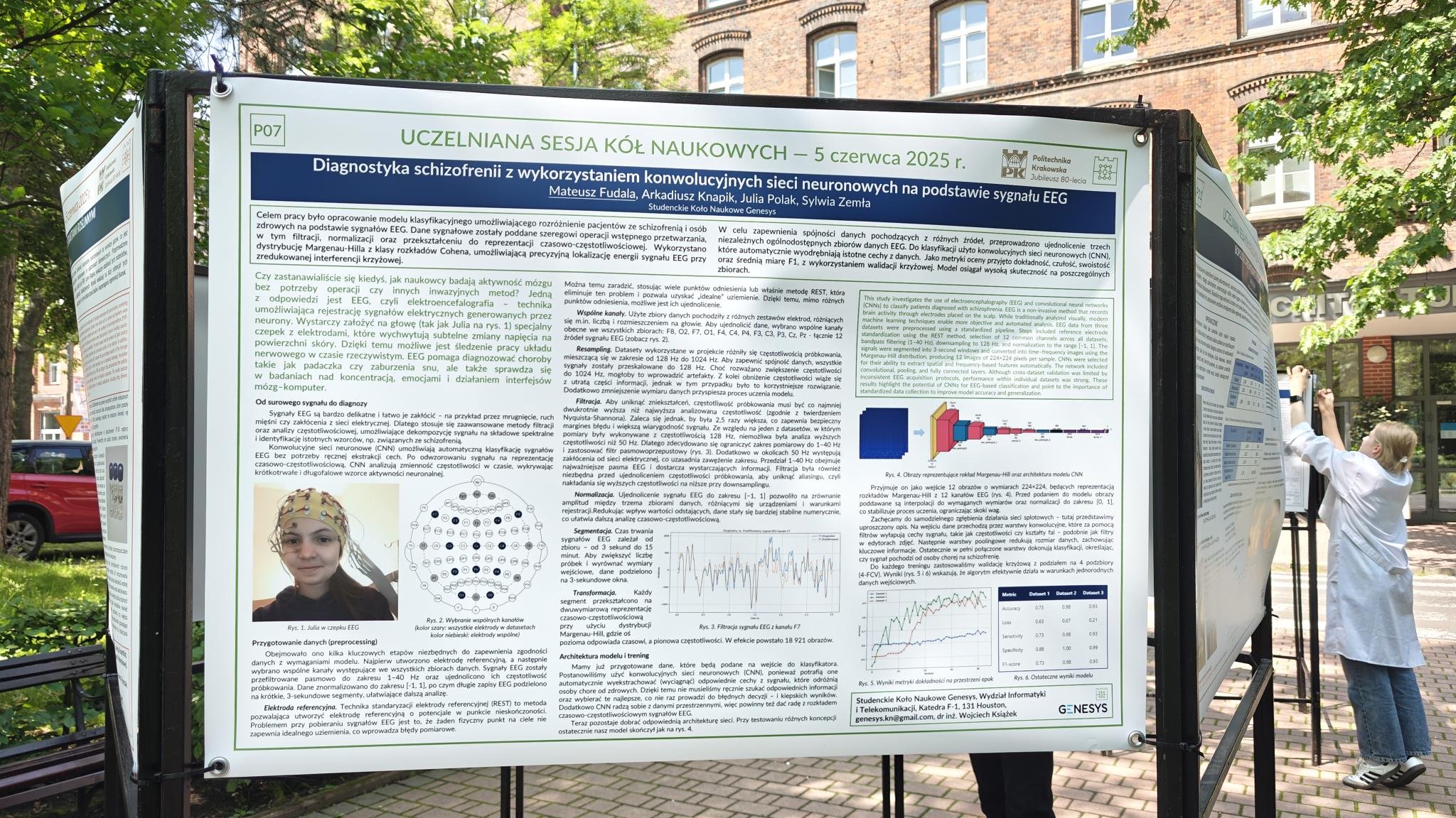 Diagnostyka schizofrenii z wykorzystaniem konwolucyjnych sieci neuronowych na podstawie sygnału EEG zajął bardzo wysokie 14. miejsce w rankingu ogólnouczelnianym! Znalezienie się w ścisłej czołówce spośród 60 prezentowanych prac to dowód na to, że nasze badania mają realny potencjał naukowy i społeczny.